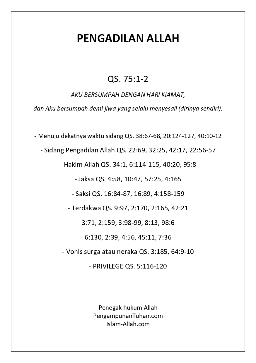 Dan tidak ada seorang pun di antara kamu yang tidak mendatanginya (neraka). Hal itu bagi Tuhanmu adalah suatu ketentuan yang sudah ditetapkan. Kemudian Kami akan menyelamatkan orang-orang yang bertakwa dan membiarkan orang-orang yang zalim di dalam (neraka) dalam keadaan berlutut.