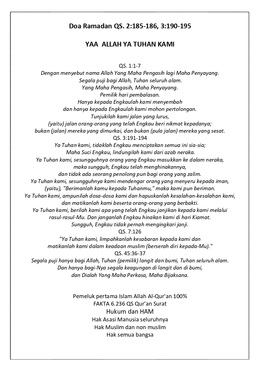 Dengan menyebut nama Allah Yang Maha Pengasih lagi Maha Penyayang. Segala puji bagi Allah, Tuhan seluruh alam. Yang Maha Pengasih, Maha Penyayang. Pemilik hari pembalasan. Hanya kepada Engkaulah kami menyembah dan hanya kepada Engkaulah kami mohon pertolongan. Tunjukilah kami jalan yang lurus, (yaitu) jalan orang-orang yang telah Engkau beri nikmat kepadanya; bukan (jalan) mereka yang dimurkai, dan bukan (pula jalan) mereka yang sesat.