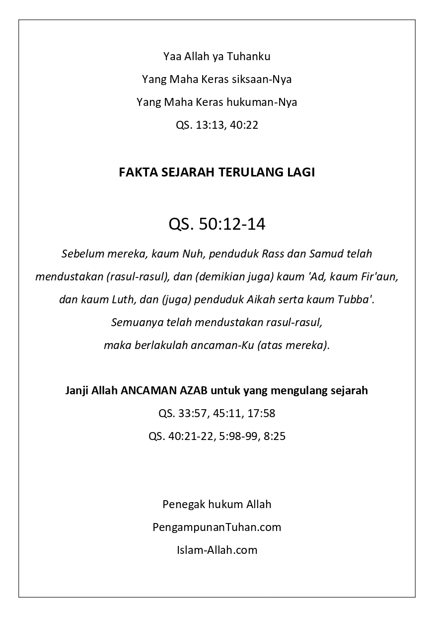 Dan orang-orang yang berada dalam neraka berkata kepada penjaga-penjaga Neraka Jahanam, "Mohonkanlah kepada Tuhanmu agar Dia meringankan azab atas kami sehari saja." Maka (penjaga-penjaga Jahanam) berkata, "Apakah rasul-rasul belum datang kepadamu dengan membawa bukti-bukti yang nyata?" Mereka menjawab, "Benar, sudah datang." (Penjaga-penjaga Jahanam) berkata, "Berdoalah kamu (sendiri!)" Namun, doa orang-orang kafir itu sia-sia belaka.